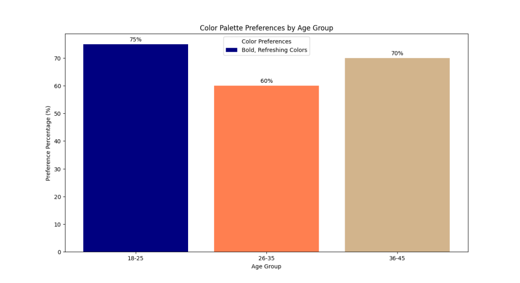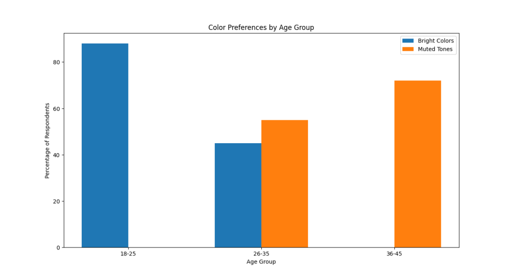 • The 26-35 age group showed a more balanced preference, with 45% favoring bright colors and 55% opting for more muted tones.