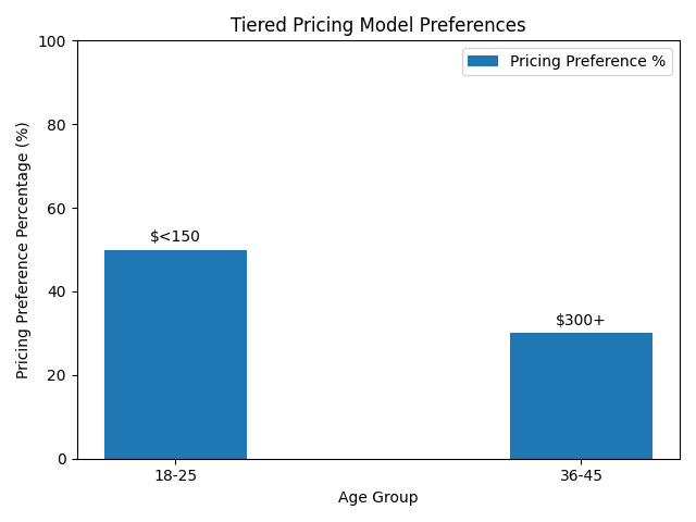 Our tiered pricing model is designed to accommodate the varying budgets of our customers. For example, the 18-25 age group, with a 50% preference for affordable pricing, is offered a selection of dresses priced under $150, while the 36-45 age group, with a 30% willingness to pay a premium for quality, has access to our luxury line starting at $300.